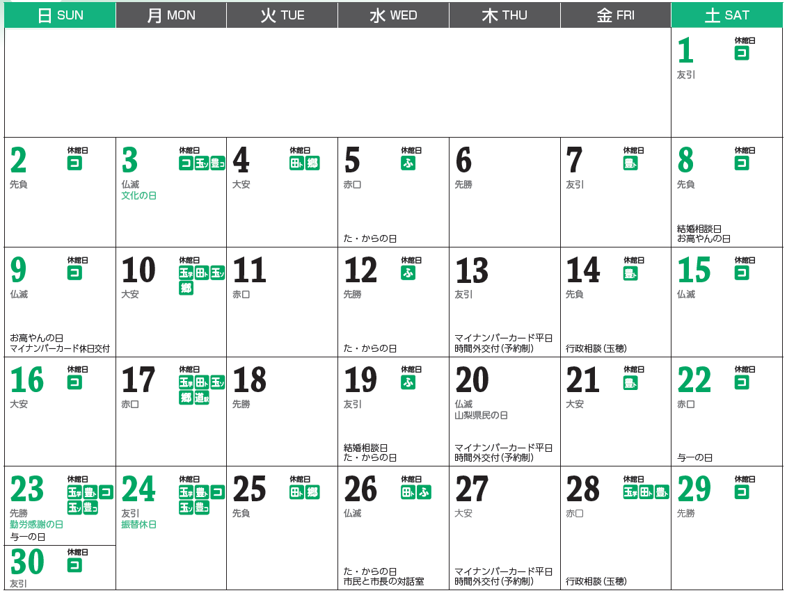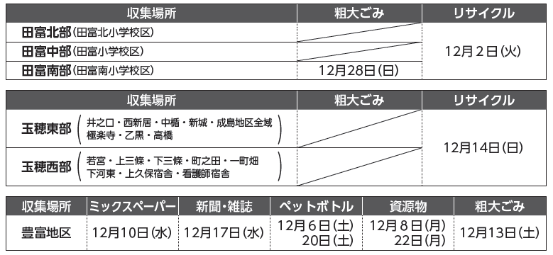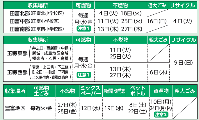注意1:田富・玉穂地区の11月3日(月・祝)、11月24日(月・休)の可燃物収集は通常通り行います。