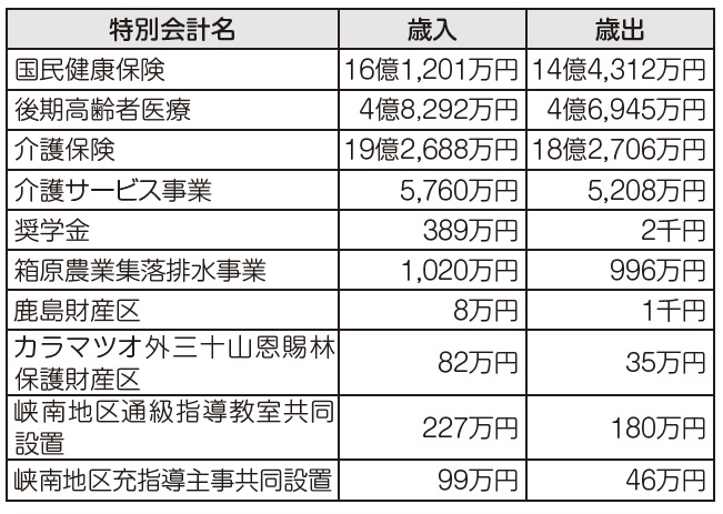 また、国民健康保険など10の特別会計は、総額で歳入40億9,766万9千円、歳出38億427万1千円となりました。