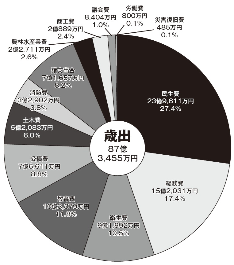 令和6年度の一般会計の決算額は、歳入が89億6,290万5千円、歳出が87億3,455万1千円となりました。令和6年度は、東別館解体事業、富士川いきいきスポーツ公園整備事業、新中学校整備事業のほか、町制施行15周年記念事業、在宅育児応援給付金事業、新中学校指定制服等購入費補助事業などを実施した結果、歳出は前年度決算と比べ5.6%の増となりました。