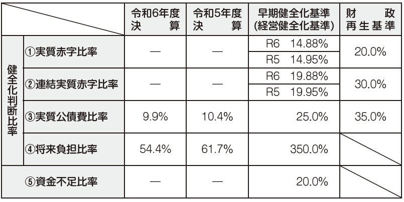 町の令和6年度の指標は、借入金の返済額が減少傾向にあることや、借入金の抑制により地方債残高が減少したことなどが要因となり、前年度と比較すると実質公債費比率は0.5%の減少、将来負担比率は7.3%の減少と改善されています。すべての指標で国の基準の範囲内でしたが、今後も財政健全化に努めていきます。