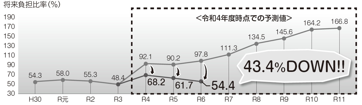 令和4年度に将来負担比率のシミュレーションを行った結果、令和11年頃まで増加していくことが予想されました。しかし、令和6年度の決算の結果も予測値より大幅に減少し、町の財政が予測値より改善されていることが示されました。