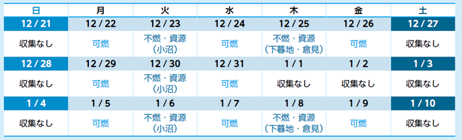 1月1日(木曜日)から1月4日(日曜日)の収集はありません。1月5日(月曜日)から各地区収集日に合わせて収集を再開します。