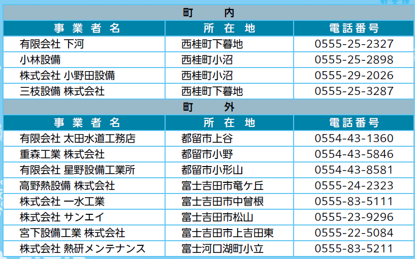万が一、ご家庭の水道管が凍結・破裂してしまった際は、西桂町指定の水道工事店にご相談ください。(修理費用は使用者負担となります。)