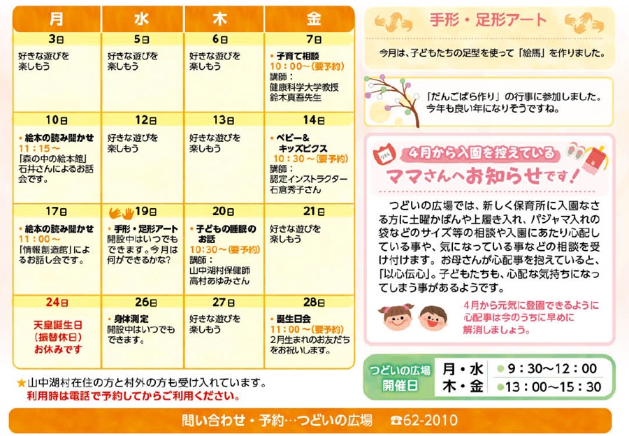 子育て 2月の予定 じゃんけんぽん つどいの広場 no.245 12/22 前の記事 次の記事 発行日 : 2025年02月01日 自治体名 : 山梨県山中湖村 広報紙名 : 広報やまなかこ 令和7年2月号 Tweet シェアする 山中湖村社会福祉協議会 山中湖観光協会 2月