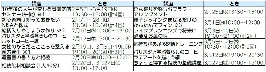 受講料がかかります(一部除く)。この他の講座情報や、受講料、直接申し込む場合の申込開始日など、詳しくは各施設のHPをご覧いただくか、各施設へお問い合わせください。