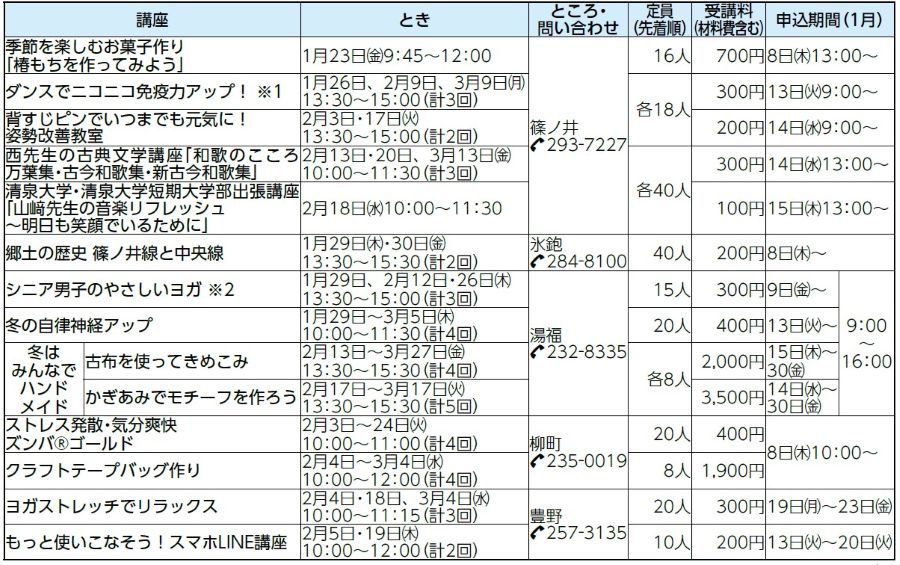 ・施設へ直接…各施設HP掲載の各申込開始日から、受講料を持参の上、直接会場へ。