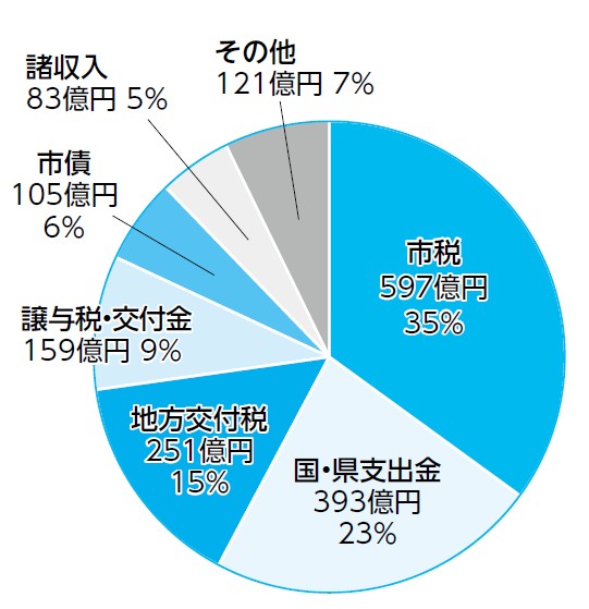 歳入のうち最も多いのは、市民の皆さんが納めた市民税や固定資産税などの市税で597億円、歳入全体に占める割合は35パーセントでした。