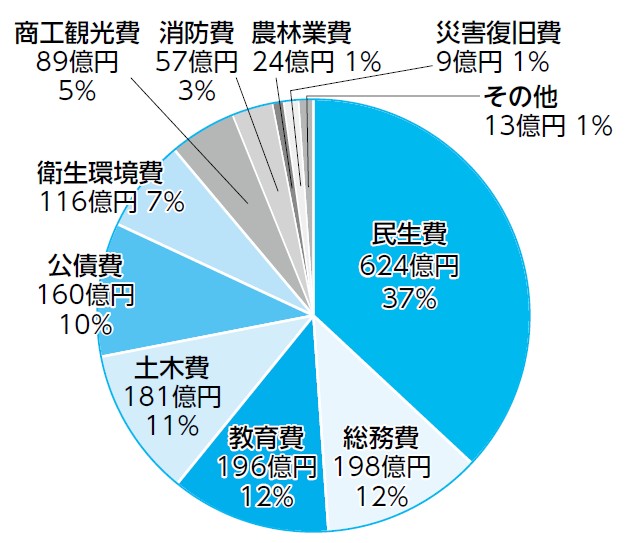 歳出のうち最も多いのは、子ども・高齢者・障害者の福祉などに充てられる民生費で624億円、歳出全体に占める割合は37パーセントでした。
