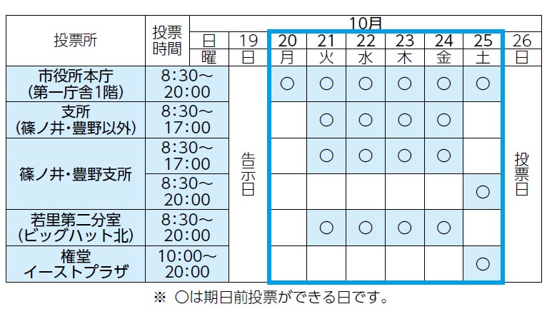 お住まいの地区に関係なく、どの投票所でも投票ができます。期間などは、左表をご覧ください。