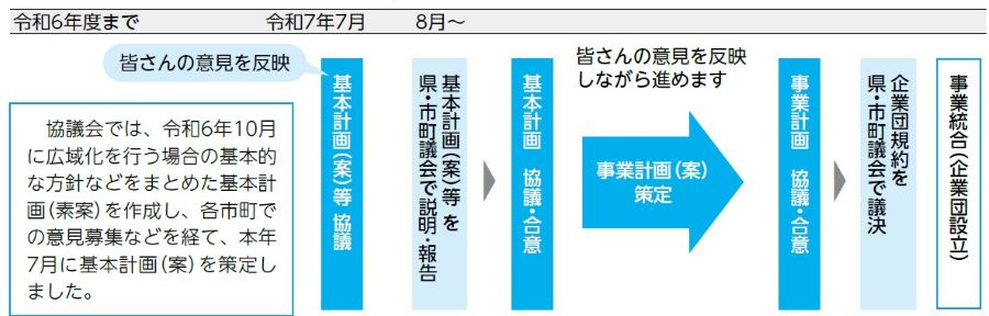 基本計画について県・市町議会で説明・報告し、協議会で合意した後は、引き続き、皆さんからのご意見をお聴きして、より具体的な事業計画(案)について、協議・検討を進めていきます。
