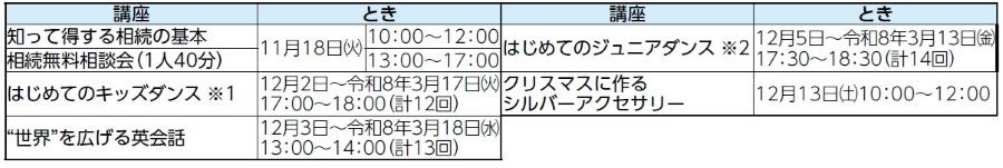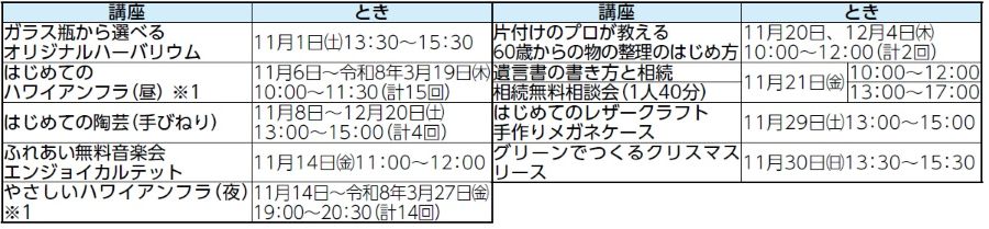 申込み:教室・講座は10月8日(水)から開催日前日までに、「ながの電子申請サービス(長野市)」から申し込むか、電話で同センターへ