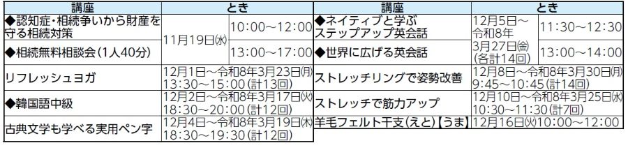 ・この他の講座情報や、受講料、直接申し込む場合の申込開始日など、詳しくは各施設のHPをご覧いただくか、各施設へお問い合わせください。