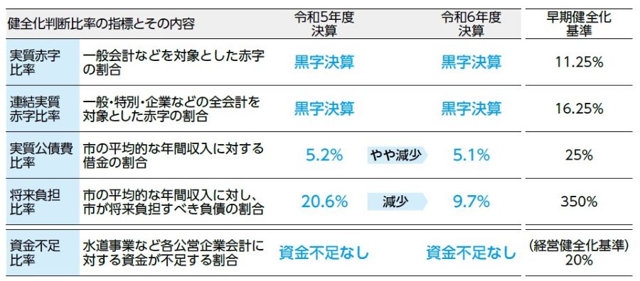 「地方公共団体の財政の健全化に関する法律」により、地方公共団体は「健全化判断比率」を算定し、公表することになっています。令和6年度決算に基づく、本市の財政分析指標をお知らせします。