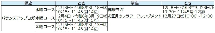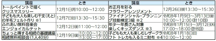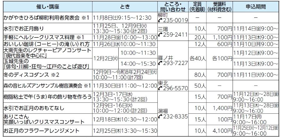 この他の講座情報や、受講料、直接申し込む場合の申込開始日など、詳しくは各施設のHPをご覧いただくか、各施設へお問い合わせください。