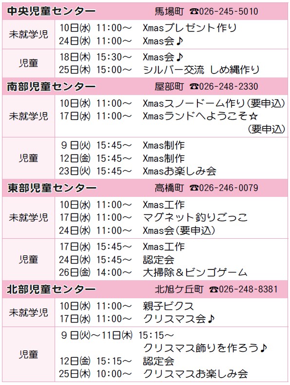 ※冬休み期間中、南部・東部・北部児童センターは、放課後児童クラブ登録児童が終日利用しています。