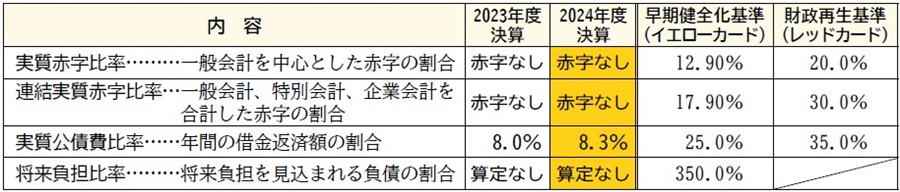 財政の健全性を示す財政指標は、いずれも早期健全化基準を下回っており、2024年度は健全な財政といえます。