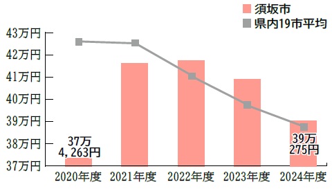市民1人当たりの市債現在高は39万275円、県内19市平均は38万7,315円で、須坂市は県内19市の中で5番目に少ない額となっています。