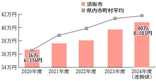 2024年度の被保険者数は、前年度比377人増の9593人でした。1人当たりの医療費は80万8685円(県内19市の中で低い方から3位)、前年度比2・1%の増で、1万6799円増加し、県平均86万9408円を6万723円下回っています。