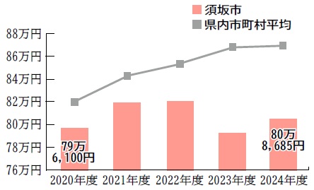 県内77市町村の中では、高い方から44番目に位置しています。また、県内市町村平均額と比較すると、9983円低くなっています。