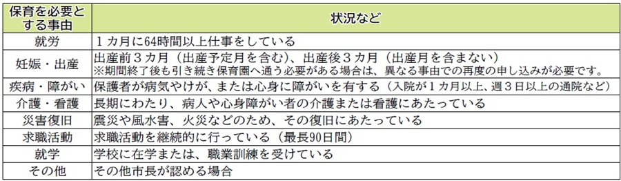 保育園は、保護者が仕事、病気、出産などの理由で家庭での保育ができないときに、お子さんを保育する施設です。入園できる基準は、お子さんの保護者(父母ともに)が常時、次にあげる「保育を必要とする事由」のいずれかに該当する場合です。基準を満たさない場合は保育園へ入園できませんのでご注意ください。