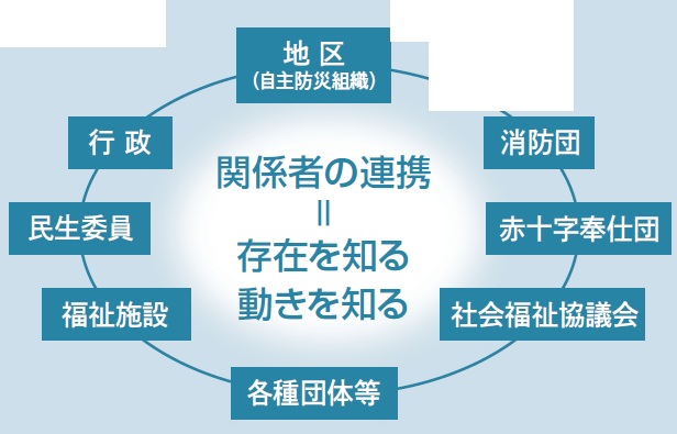 地域での防災活動の要となるのは自主防災組織ですが、地域の中にはさまざまな団体があります。災害時はそれぞれが地域の支援者として活動しなければなりません。