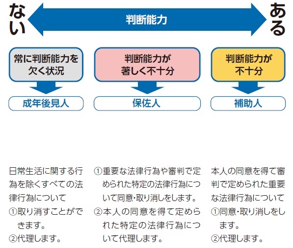 「法定後見制度」は、本人の判断能力に応じて「後見」「保佐」「補助」の3つの類型に分けられます。
