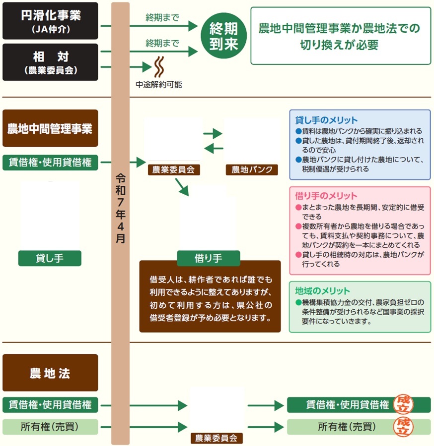 農地の貸借は、貸付人(所有者)と借受人(耕作者)の同意により手続きを行いますが、令和7年4月から農地中間管理事業か農地法による手続きとなりました。様々なケ-スがあるため、イラストで案内させていただきます。