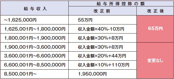 給与所得者に適用される給与所得控除について、給与収入金額が190万円以下の方の最低保障額が55万円から65万円に引き上げられます。