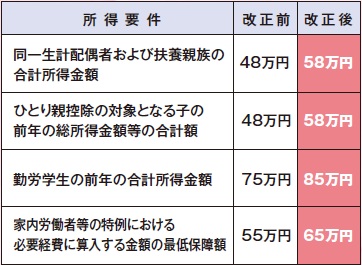 各種扶養控除等の適用を受けるための所得要件額が10万円引き上げられます。