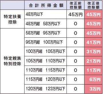 特定親族特別控除では、特定扶養控除対象の19歳以上23歳未満の方のうち、合計所得金額が58万円(改正後の所得要件)を超えて扶養控除を適用できない方についても段階的に控除を受けられるようになります。