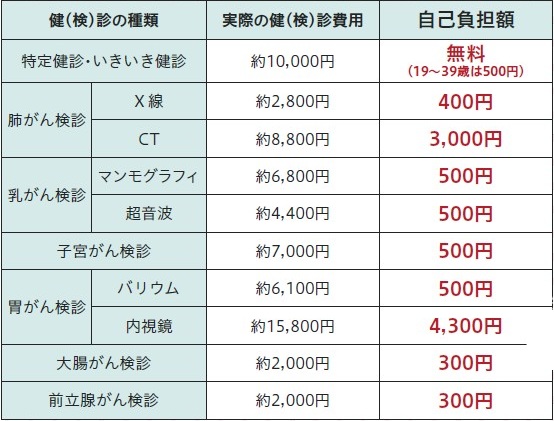 元気くん:各健(検)診の費用と自己負担額はこんな感じだよ。