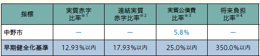 (実質赤字比率および連結実質赤字比率は赤字額がないため、将来負担比率は算定の結果マイナスのため「-」と記載しています。)