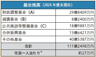 市の貯金に当たるものが「基金」です。2024年度末の基金残高は111億2498万円で、23年度末に比べ8億7553万円の減少となりました。A~Cを合算した「主要3基金」は、23年度末に比べ160万円の増加となりました。