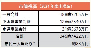市の借金にあたるものが、「市債」です。本市の2024年度末の全会計市債残高は346億7422万円で、23年度末に比べ6億9763万円の減少となりました。