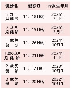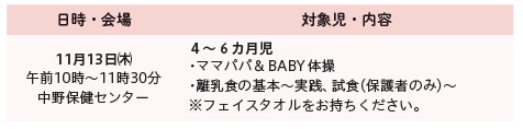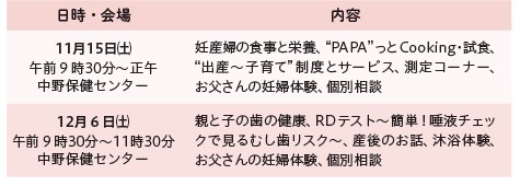 持ち物:筆記用具、母子健康手帳、飲み物、サポートブック(お持ちの方のみ)、[11/15のみ]エプロン、バンダナ、子育て応援ガイドブック
