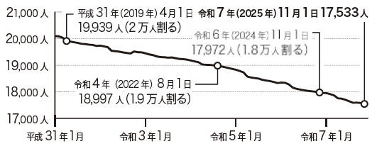 人口は昨年から439人の減少が見られ、11月1日時点の推計人口1万7533人となりました。(毎月人口異動調査に基づく推計人口)