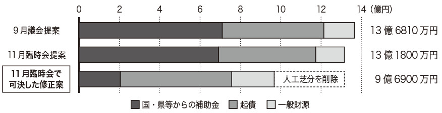 今回提案の補正予算案は、9月議会で否決となった13億6810万円から、工事の工法変更により5010万円減額の13億1800万円として再提案したものです。採決の結果、役員の負担軽減と公平な競技実施のためにアイストラック等の整備は必要と認められる一方で、ランディングバーン等の人工芝化は、整備後の経費的負担や、施設の後利用に関する検討が不十分であるとし、人工芝化に係る部分を減額した総額9億6900万円とする修正案が、賛成多数で可決となりました。