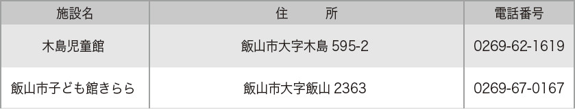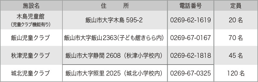 飯山市では、児童に健全な遊びを与え、情操を豊かにすることを目的に児童クラブ等を設置しています。詳しくは、当協議会HPをご覧ください。お問合せは、飯山市社協(【電話】0269-62-2840)までお願いいたします。
