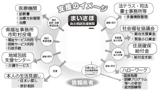 経済的な問題で生活に困っている、失業している、引きこもりやニートで悩んでいる、病気があり仕事や生活が不安、働いた経験がないなど、生活や仕事の悩みを抱えている方ならどなたでもご相談いただけます(生活保護受給者は除きます)。相談員が悩みをお聞きし、課題を整理しながら、問題解決に向けて一緒に考えていきます。ハローワーク、医療機関、司法書士事務所等、専門的な機関にお繋ぎすることもできます。