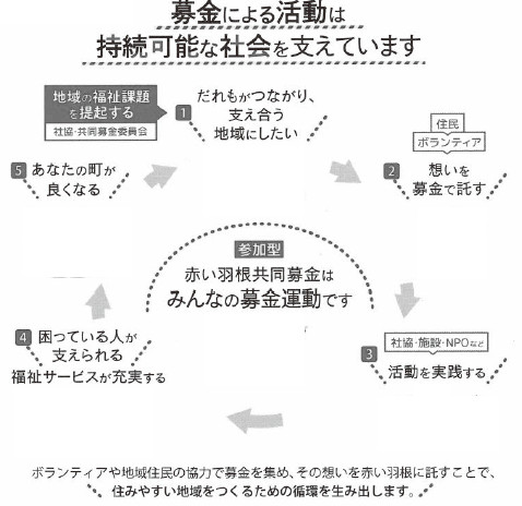 赤い羽根共同募金は、じぶんのまちに還元される募金です。ご協力いただいた募金は、飯山市社協で行うさまざまな事業の運営、飯山市のボランティア団体の活動等に活用されます。