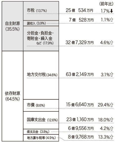 ふるさと寄附金の減(約7000万円)、市民税及び固定資産税の減(約4000万円)があったものの、城北小学校建設に係る市債の増(約3億6000万円)及び国庫支出金の増(3億5000万円)、財政調整基金や環境施設整備基金等の繰入金の増(約2億4000万円)、地方交付税の増(約1億9000万円)などにより増加しました。