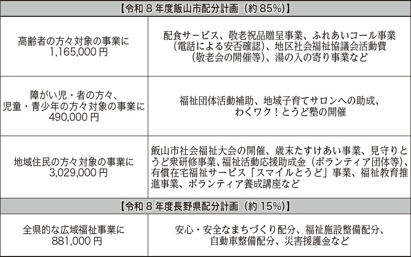 寄せられた募金の約15%が長野県全体の福祉事業(安心・安全なまちづくり配分、災害援護金など)に、残りの約85%が飯山市内の福祉事業(配食サービス、ボランティアの育成、各福祉団体への助成など)に使われます。