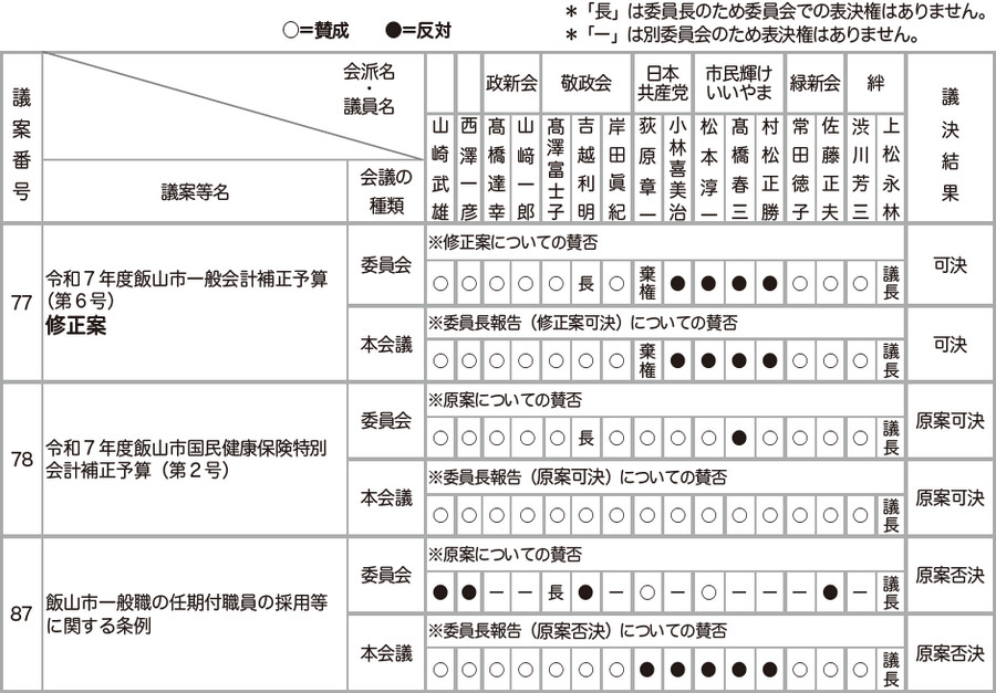 議案第87号「飯山市一般職の任期付職員の採用等に関する条例」については、職員の公募に関して例外規定が設けられていることにより、依然として公平性・透明性が保たれない等の意見があり、本会議の採決では賛成少数で原案否決となりました。