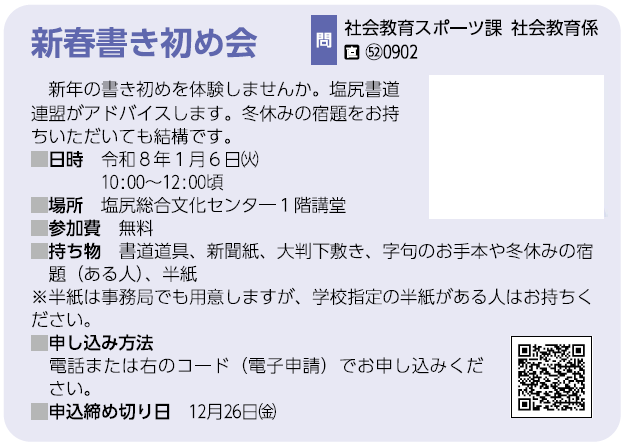 イベント 新春書き初め会 19/40 前の記事 次の記事 発行日 : 2025年12月01日 自治体名 : 長野県塩尻市 広報紙名 : 広報しおじり 令和7年12月号 Tweet シェアする 令和8年度に採用する市職員を募集 令和7年度信州まつもと空港冬期利用促進助成金制度のご案内