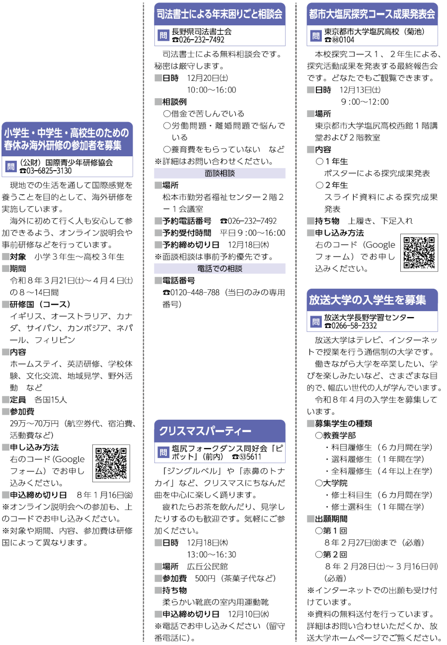 くらし くらしの情報~伝言板(2)~ 28/40 前の記事 次の記事 発行日 : 2025年12月01日 自治体名 : 長野県塩尻市 広報紙名 : 広報しおじり 令和7年12月号 Tweet シェアする くらしの情報~伝言板(1)~ 出張一時的(デイ)保育を行います