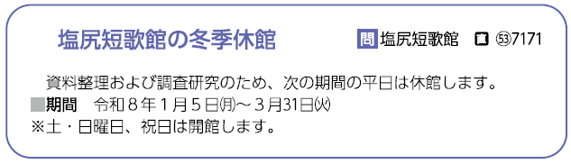 くらし 塩尻短歌館の冬季休館 32/40 前の記事 次の記事 発行日 : 2025年12月01日 自治体名 : 長野県塩尻市 広報紙名 : 広報しおじり 令和7年12月号 Tweet シェアする 年末年始カレンダー レザンホールへ行こう!