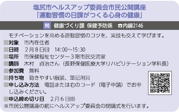講座 塩尻市ヘルスアップ委員会市民公開講座「運動習慣の日課がつくる心身の健康」 11/33 前の記事 次の記事 発行日 : 2026年01月01日 自治体名 : 長野県塩尻市 広報紙名 : 広報しおじり 令和8年1月号 Tweet シェアする 市政トピックス(2) 農地相談会を開催します