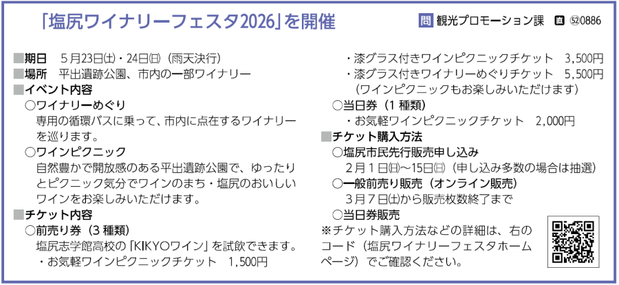 イベント 「塩尻ワイナリーフェスタ2026」を開催 25/33 前の記事 次の記事 発行日 : 2026年01月01日 自治体名 : 長野県塩尻市 広報紙名 : 広報しおじり 令和8年1月号 Tweet シェアする 塩尻環境スタンダード認証・登録制度に新たな事業所が登録されました くらしの情報~伝言板~