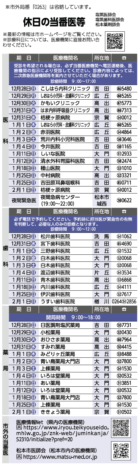 くらし 休日の当番医等 30/33 前の記事 次の記事 発行日 : 2026年01月01日 自治体名 : 長野県塩尻市 広報紙名 : 広報しおじり 令和8年1月号 Tweet シェアする YOUMEX ARENA(ユメックスアリーナ) ~イベント情報~ ご相談はこちらへ