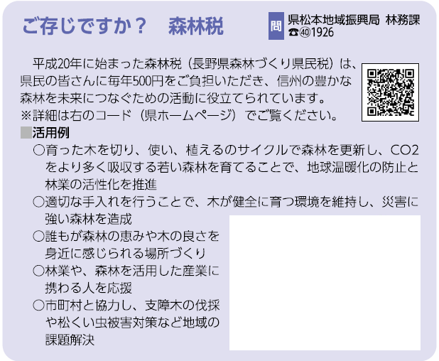 くらし ご存じですか?森林税 16/36 前の記事 次の記事 発行日 : 2026年02月01日 自治体名 : 長野県塩尻市 広報紙名 : 広報しおじり 令和8年2月号 Tweet シェアする くらしの情報~お知らせ~ くらしの情報~募集~